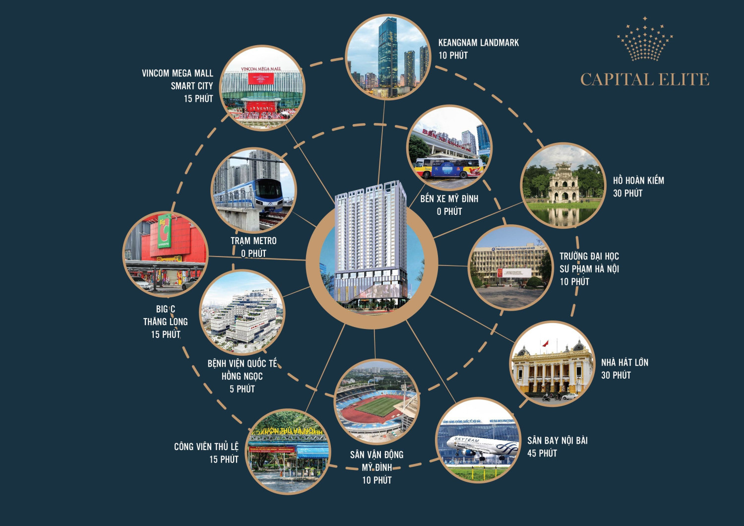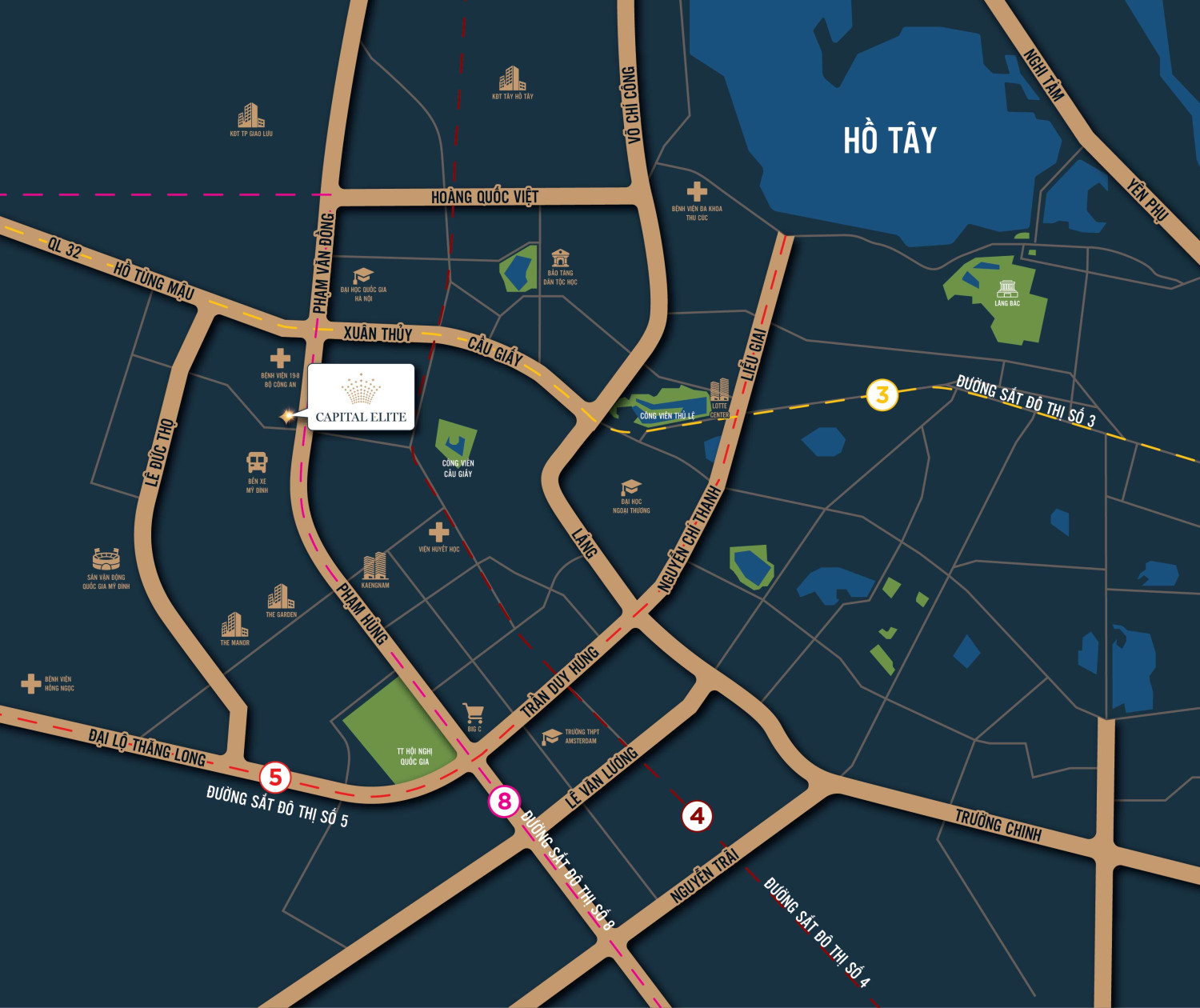 Capital Elite 位于规划完善、活力四射且高端的城市区域,聚集高知识阶层与快速发展的社区。周边拥有众多顶级住宅及办公综合体,例如 Keangnam、Indochina Plaza、The Manor,共同构筑现代都市生活的繁荣生态圈。