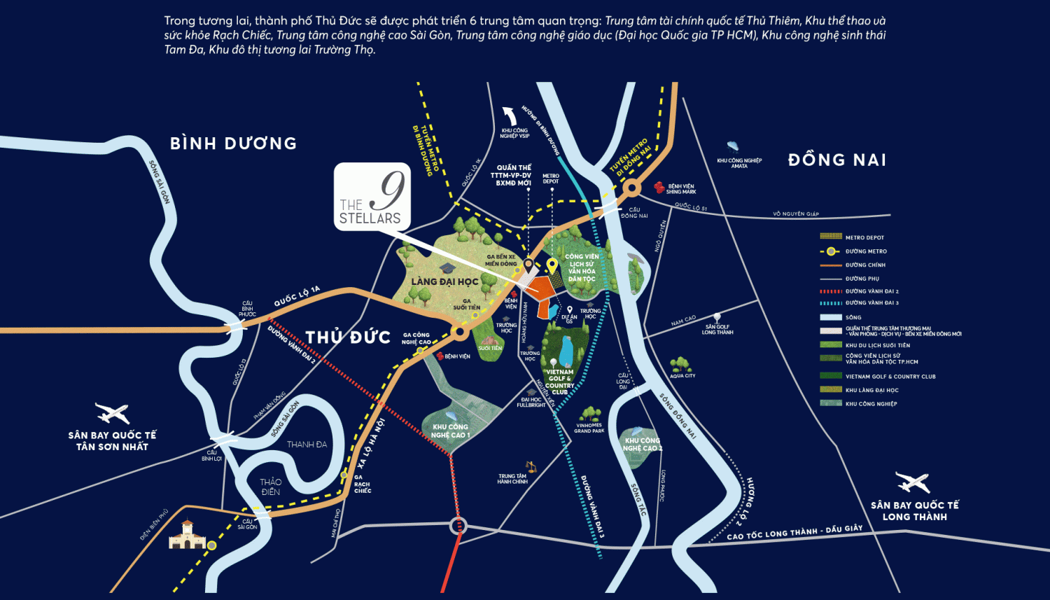The 9 Stellars 城市综合体由 Sơn Kim Land 开发,位于守德市第 9 郡的核心黄金位置(胡志明市)。联排别墅、独栋别墅与公寓的综合体坐落在胡志明市东部基础设施发展最快、交通最领先的区域。居民可直接享受周边基础设施,如新东部公交总站、地铁 1 号线、河内高速公路、3 号环线等,实现快速便捷的城市通勤。