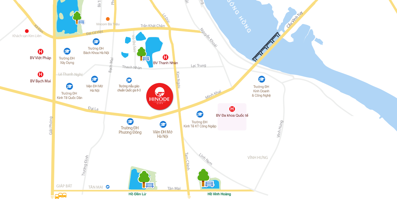 位于河内市 Hai Ba Trung 郡 Minh Khai 201 号——首都南部重要门户位置,Hinode City 所处区域不仅拥有人口密集、受教育程度高的居民群体,同时也是政府重点投资、优先发展现代化基础设施的区域。正因如此,Hinode City Minh Khai 被客户与房地产投资者期待成为该区域未来全新的、更现代、更理想的高品质生活象征。