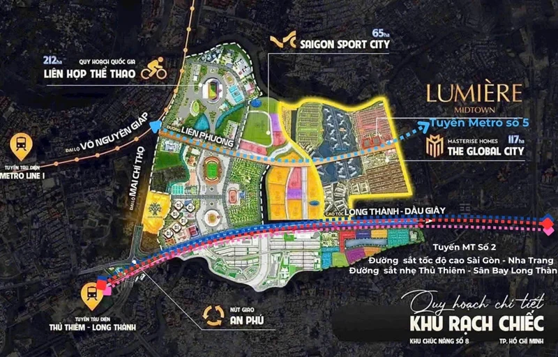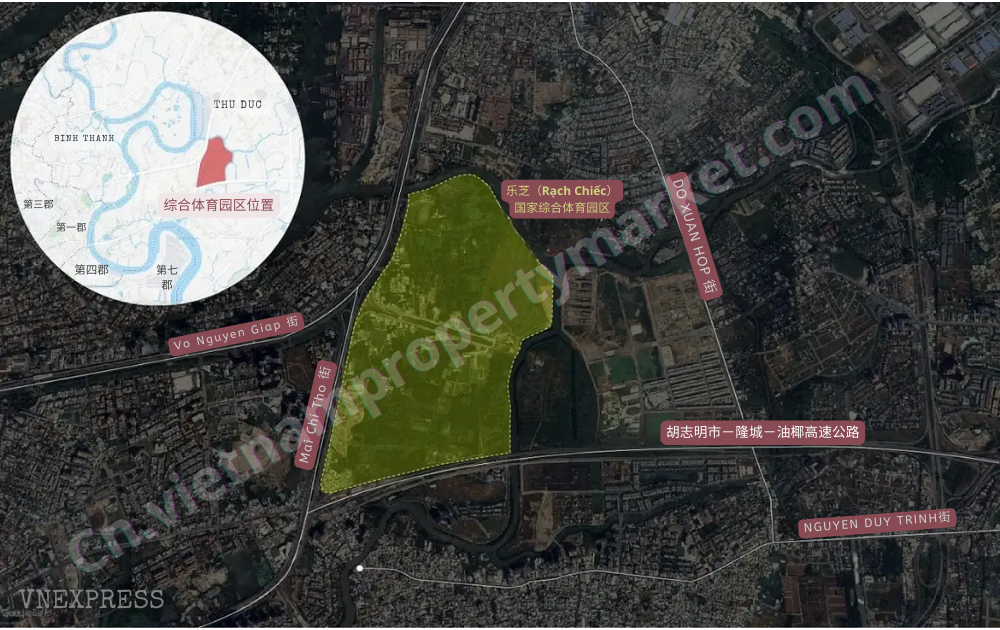 乐芝(Rạch Chiếc)国家综合体育园区最早于 1994 年提出规划,但由于投资资金不足以及制度和政策方面的限制,该项目 30 多年来一直未能落地实施。项目位于城市东部门户位置,毗邻梅志寿(Mai Chí Thọ)大道、河内公路(现武元甲大道)以及胡志明市-隆城-油椰高速公路等重要交通干线。