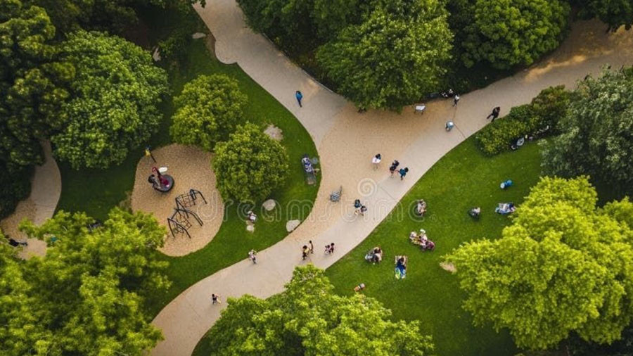 从中央公园延伸到各组团之间的多重绿化空间,形成了连续的“卫星公园体系”。