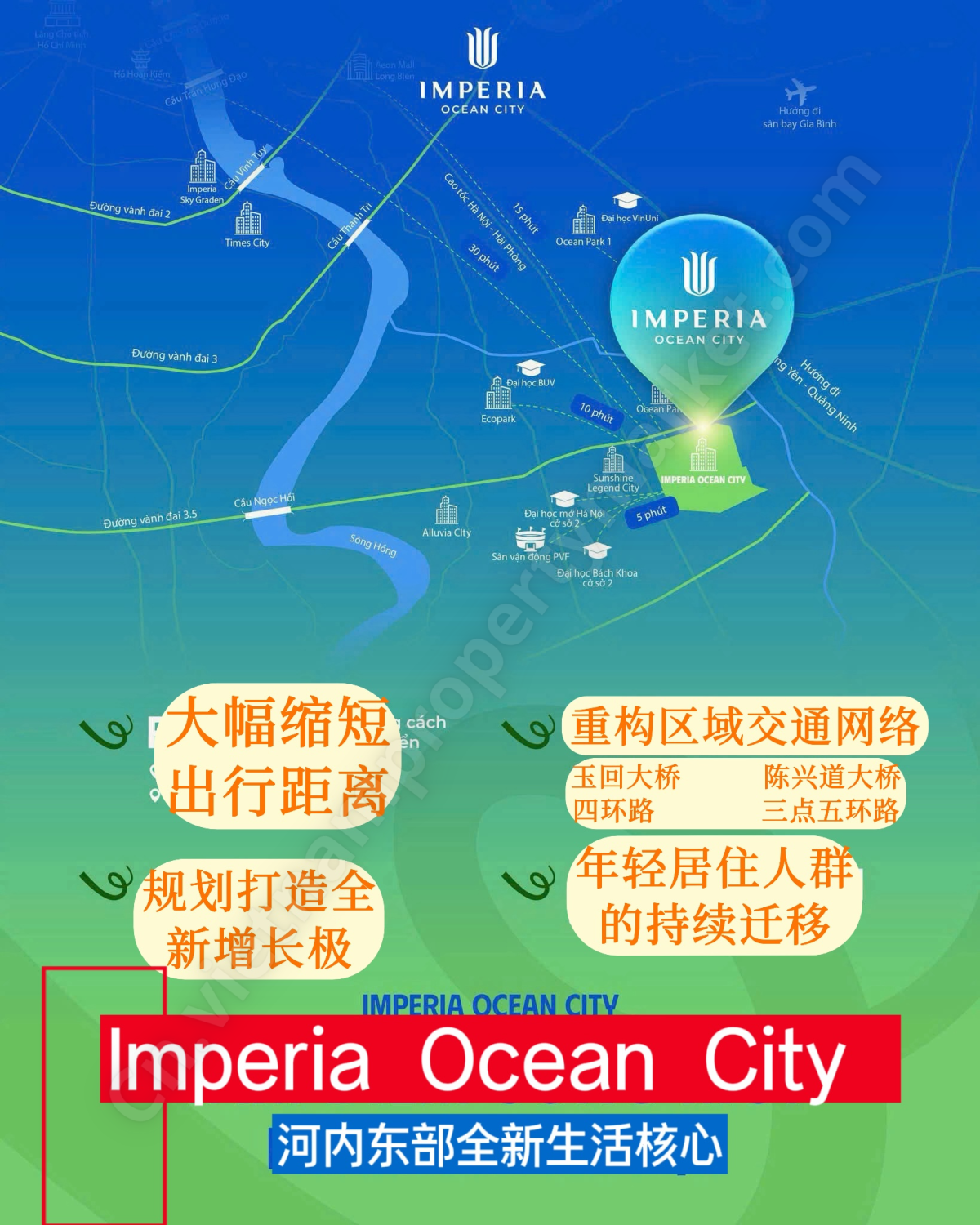 Imperia Ocean City 是 I series 高端公寓产品线中的一个住宅项目——高端公寓收藏系列(Premium Project)。该项目由 MIK Group 首次在 Ocean City(涵盖 Ocean Park 2 与 Ocean Park 3)、兴安省开发。以现代都市家庭为核心目标,Imperia Ocean City 致力于打造精致、尊贵、便利的生活空间,配备多样化的设施与服务,并拥有充满绿意的生活环境。