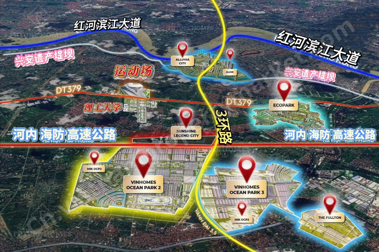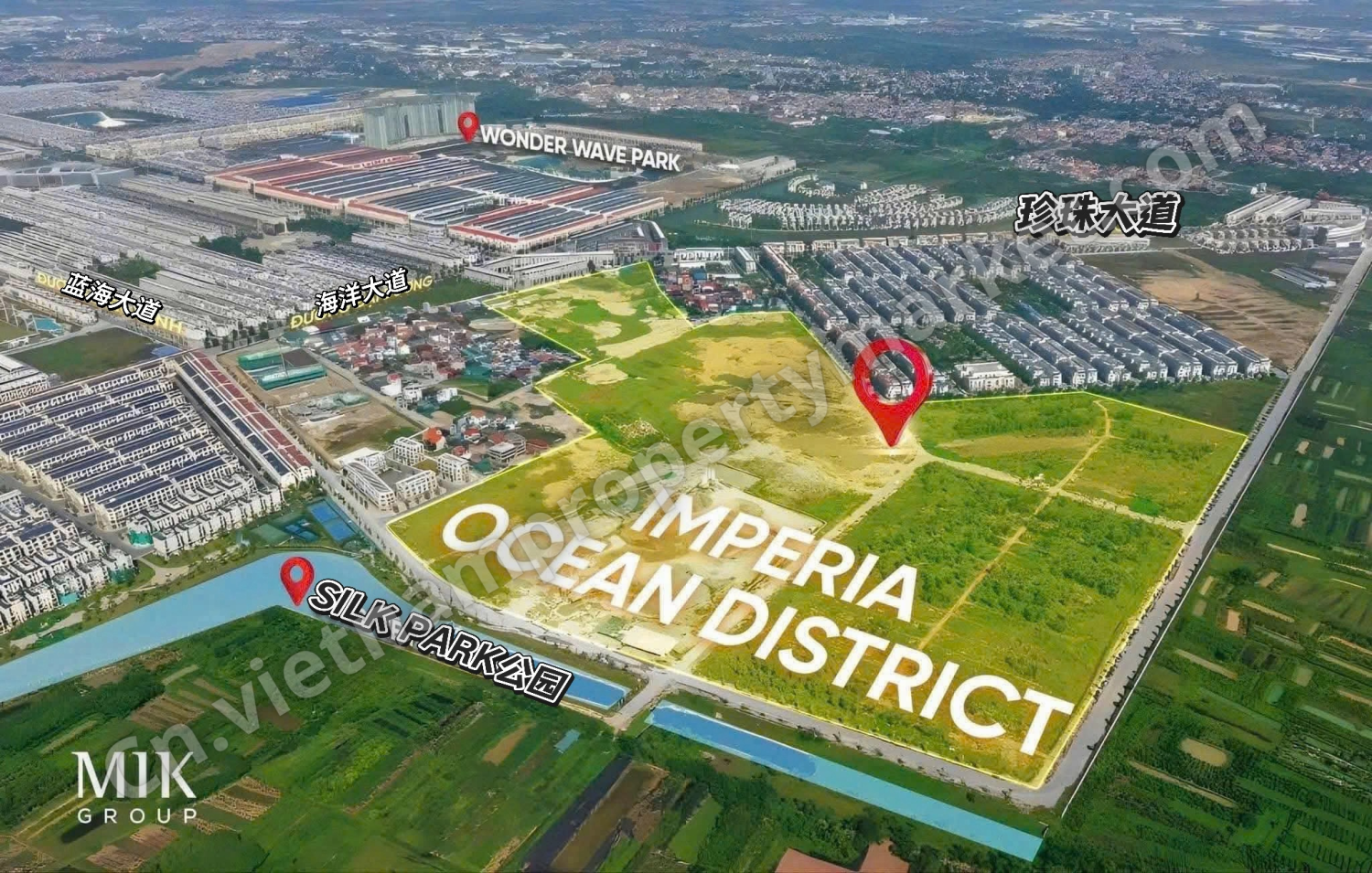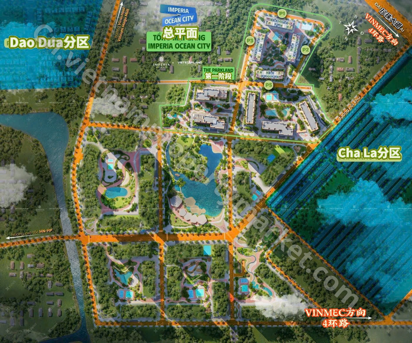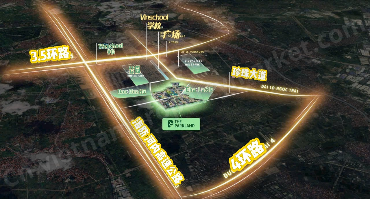The Parkland 项目位于 Ocean Park 2 都市区的核心位置,紧邻多个高端别墅分区,包括 Chà Là(椰枣岛)别墅区、Đảo Dừa(椰子岛)别墅区、Sao Biển(海星岛)别墅区以及 Kinh Đô Ánh Sáng(光之王国) 分区。