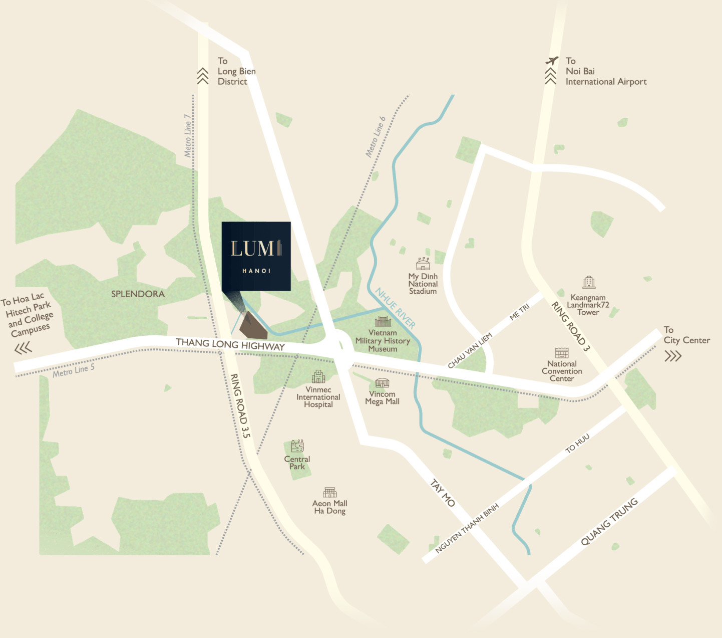 项目紧邻 Thăng Long 大道 与 3.5 号环路,交通优势显著,可减少通勤时间并避开高峰拥堵。随着地铁 5、6、7 号线 投入运营,Lumi Hanoi Capitaland 的区域连通性将提升至全新高度,为居民带来更加便捷、充满活力的生活体验。