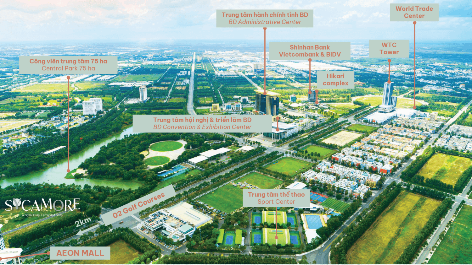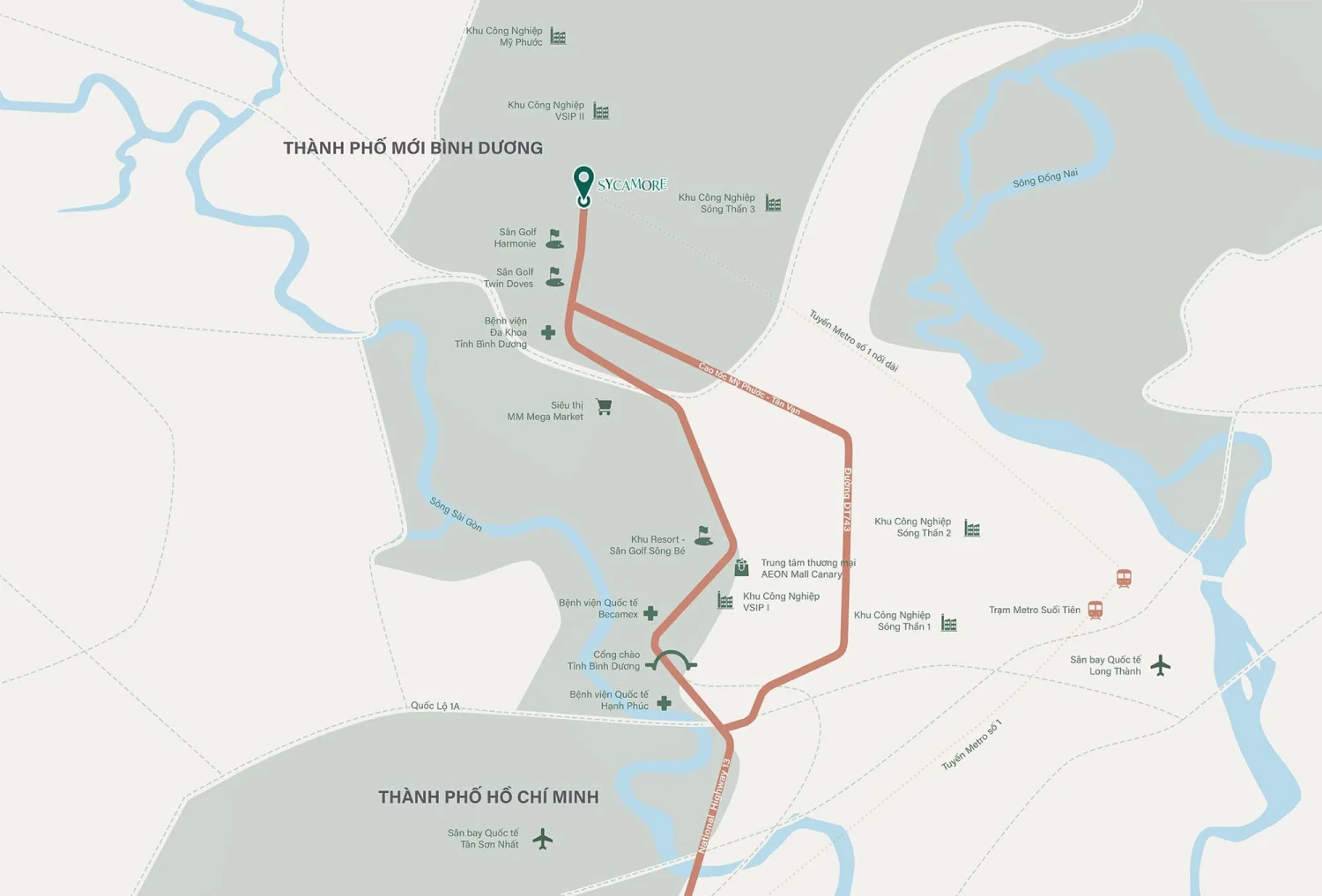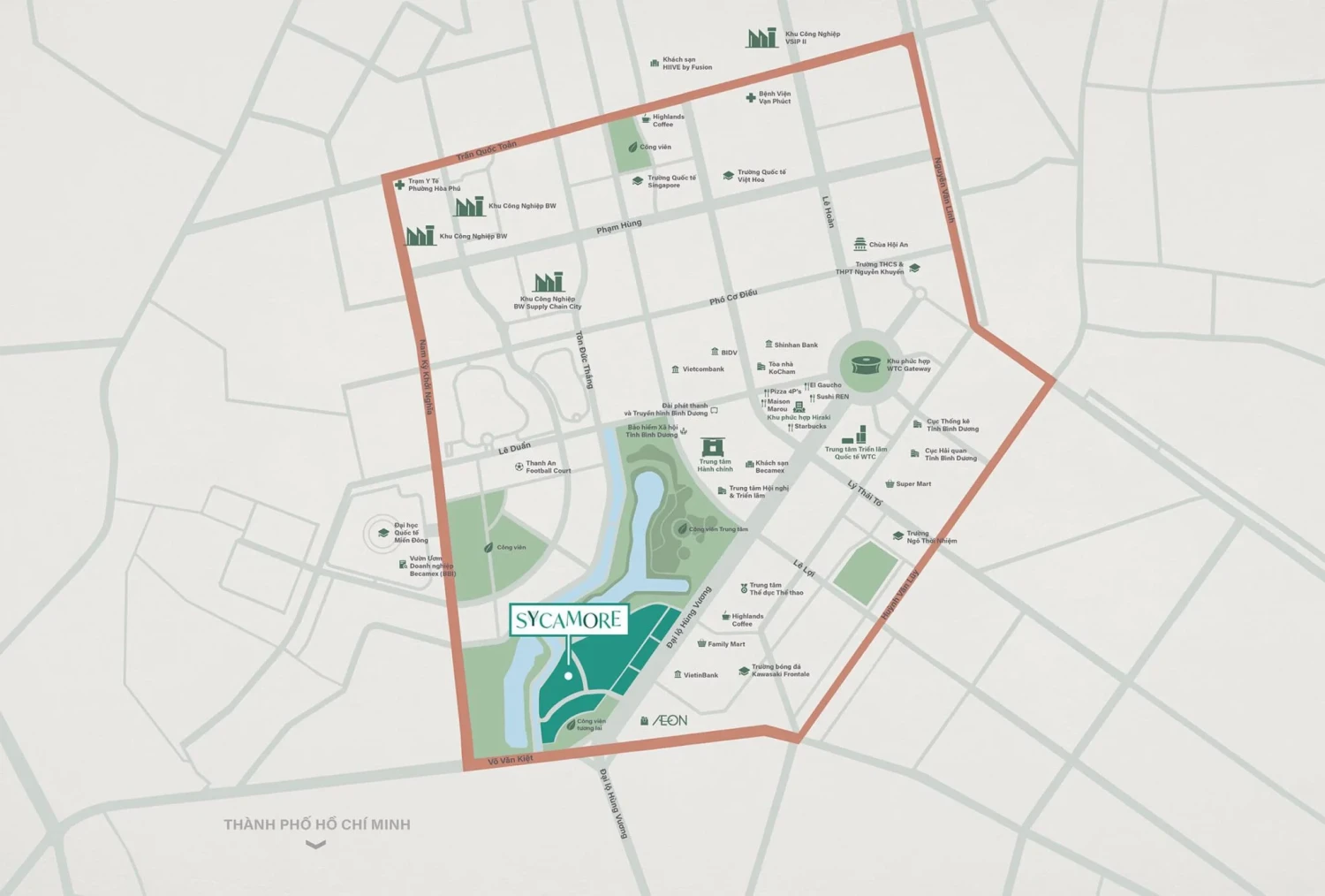 Sycamore 位于平阳省土龙木市新城核心地带的“黄金大道”——Hùng Vương 大道上,这是该区域的主干中轴线。凭借卓越区位,居民可轻松连接多个重要目的地: